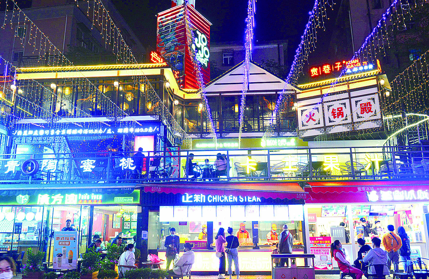 ▲希尔顿集装箱步行街,各店霓虹灯闪耀,市民品尝美食,享受夏夜美好时光