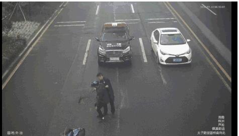 当时正值上班早高峰,男子因驾驶不慎摔倒,路上车流不息,他随时可能被来往疾驰的车辆碾压。苏秦见状,立即打开双闪灯,将车停在男子跟前并下车。