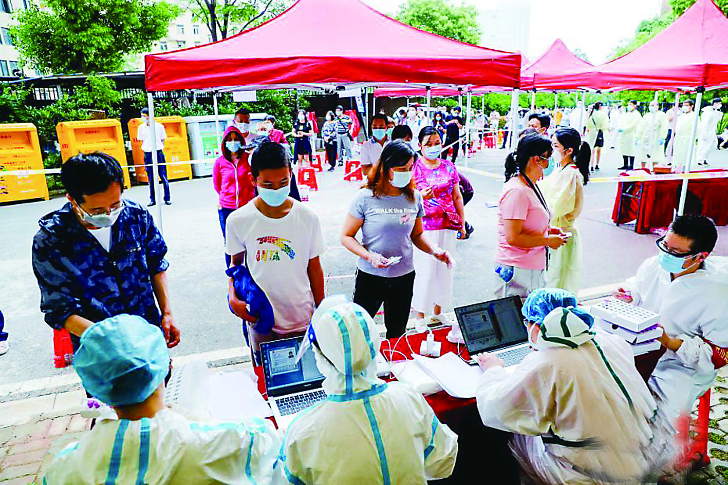 武汉市 开展全员核酸筛查 5月16日,在武汉洪山区保利蓝海郡小区检测点,工作人员在核对参加检测的市民信息。武汉近日开始对全市市民有序开展核酸检测。 (据中新社)