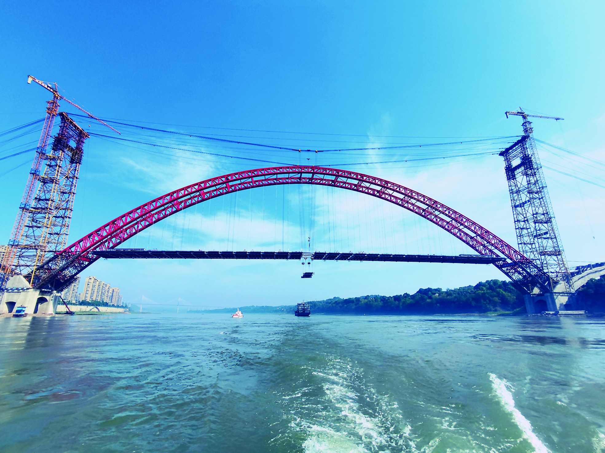 5月18日,合江长江公路大桥主梁正在进行最后的吊装作业。 当日,位于四川合江县的飞燕式钢管混凝土系杆拱桥——合江长江公路大桥主梁成功合龙,为2020年底建成通车奠定基础。合江长江公路大桥主跨507米,主桥长668米,是“渡改桥”重点工程,项目建成后将成为连接合江县南岸老城区和北岸新城区的重要通道,彻底结束两岸群众摆渡过江的历史。 (据新华社)