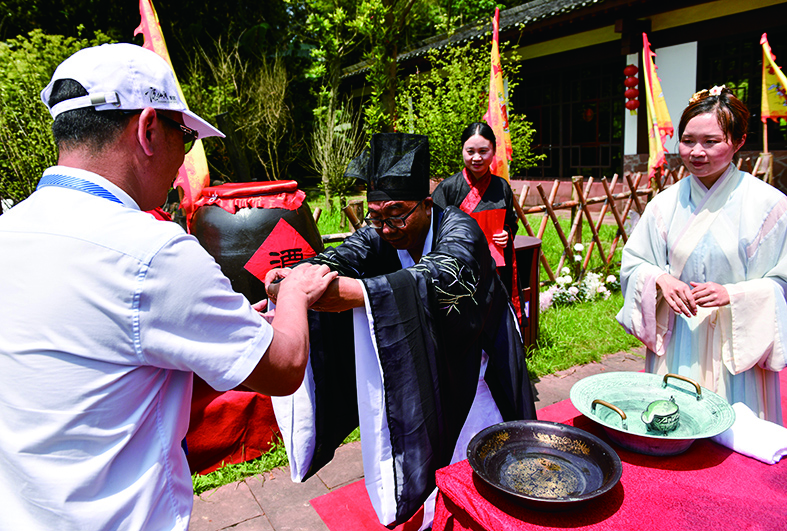 ▲酒仙湖油桐花节活动现场,身着古装工作人员在表演古法酿酒,并向游客敬酒 记者 刘震 摄