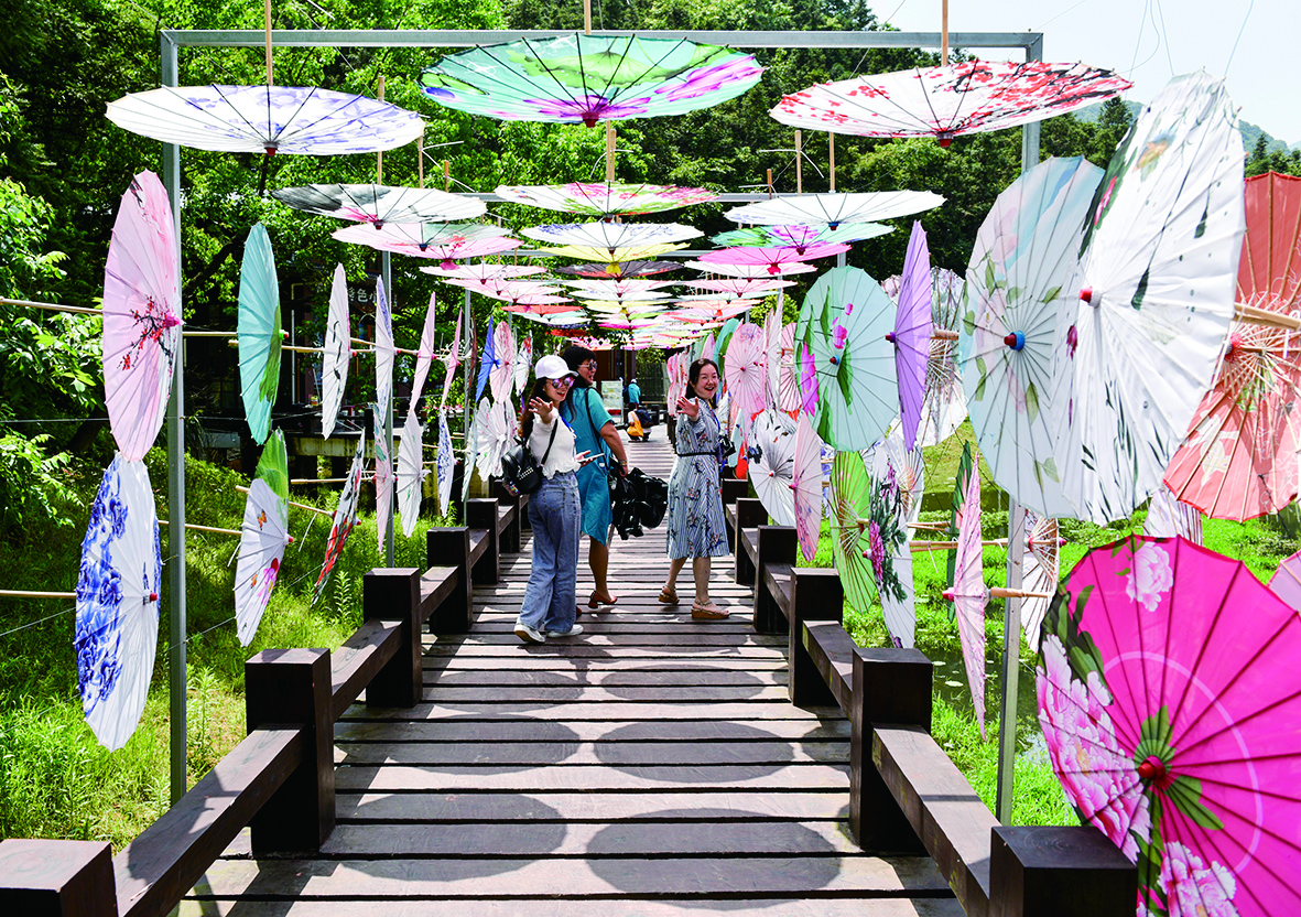 ▲酒仙湖油桐花节活动现场,游客从一座装饰有油纸伞的木桥上走过 记者 刘震 摄