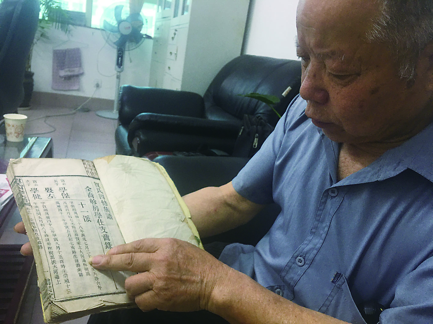 ▲贺仁斌展示贺氏家谱 全媒体记者 俞强年 摄