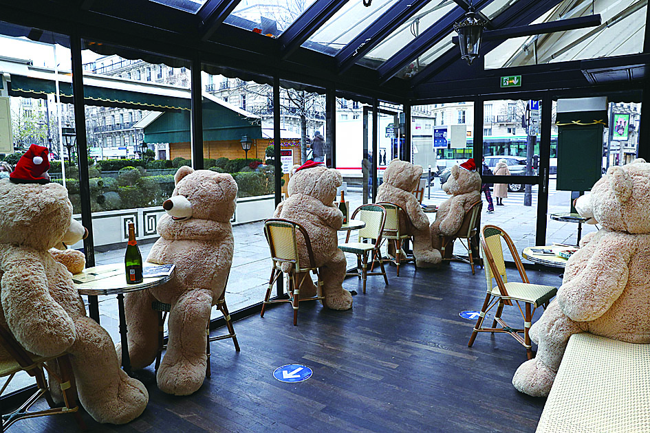 这是12月16日在法国巴黎双叟咖啡馆拍摄的玩具熊。 近日,法国巴黎著名的双叟咖啡馆被一群玩具熊“占领”,为因新冠疫情而关闭的咖啡馆带来一些幽默的“烟火气”和节日气氛,引起路人驻足围观。 (据新华社)