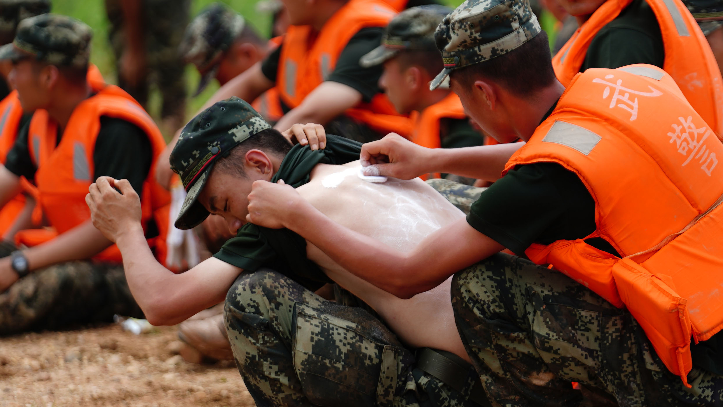 ▲7月11日,在江西省鄱阳县江家岭村,武警战士在执行抗洪任务的休息间隙互相涂抹药粉,连日奋战让许多战士长痱子或晒伤