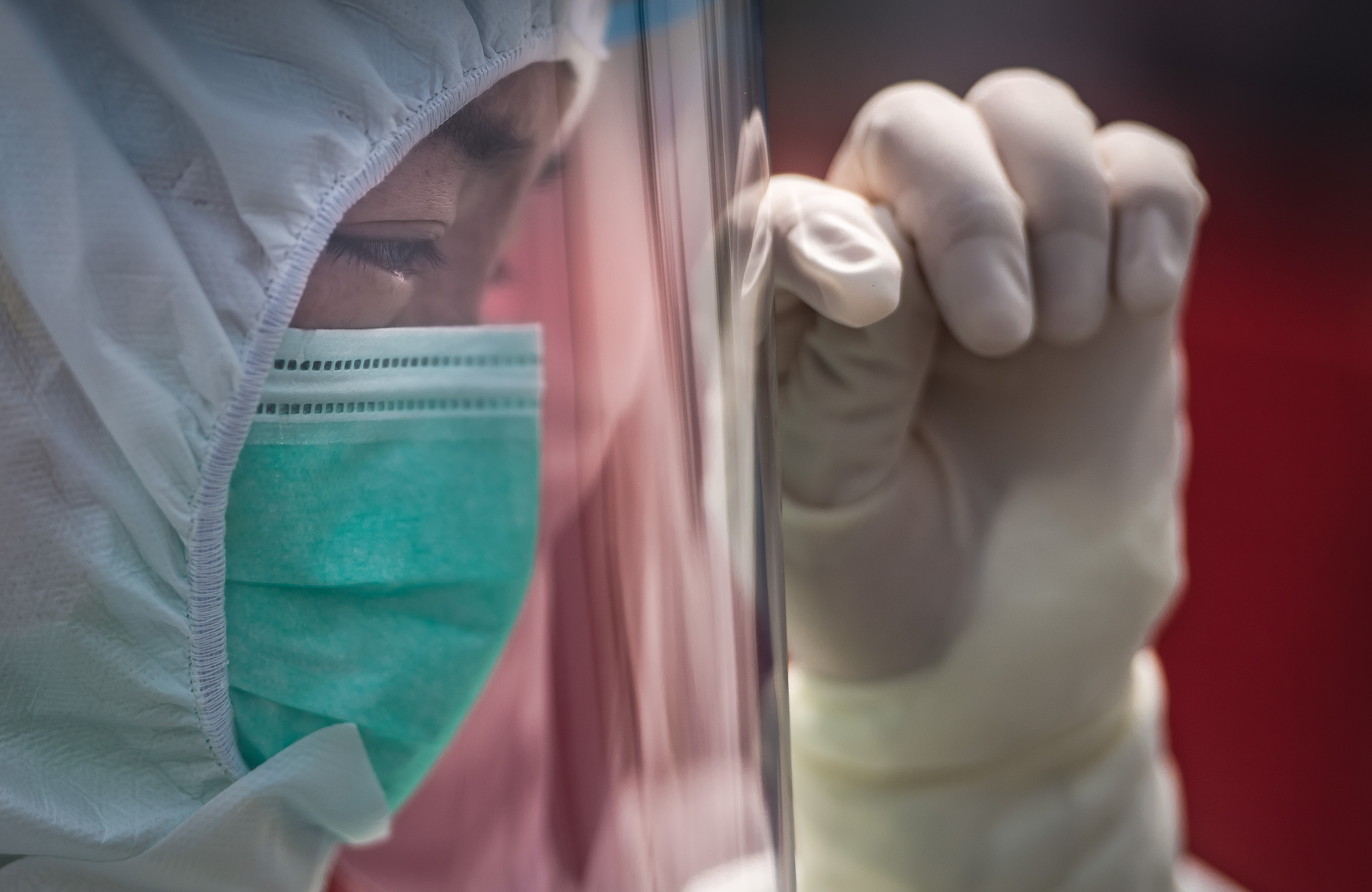 ▲2月12日,医务人员在武汉体育中心方舱医院前竖起拇指为自己和同伴加油鼓劲