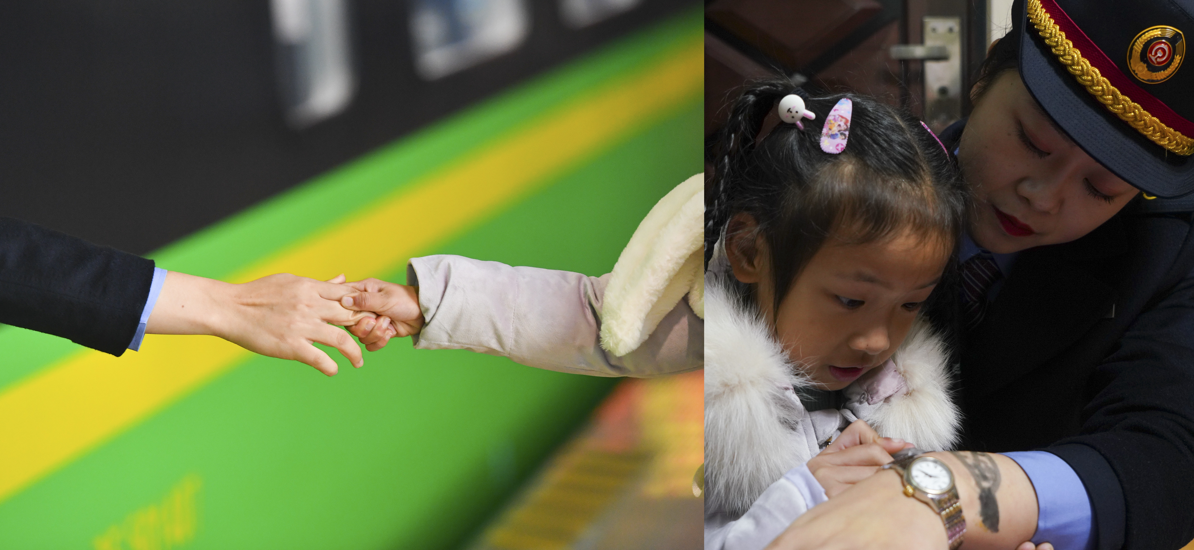 ▲这是一张拼版照片,左图为:1月3日,朱梓芮和母亲卞菁在南昌西站站台分别;右图为:1月5日,朱梓芮为即将出乘的卞菁画上手表。南昌客运段列车值班员卞菁因工作原因与女儿朱梓芮聚少离多,朱梓芮通过画“手表”的方式期盼妈妈早些回家