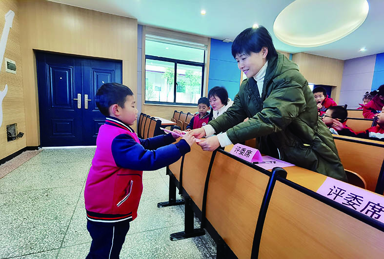 12月17日下午,株洲市二中青龙湾小学开展了2021年度校园记者招募面试选拔。图为评委老师为学生颁发入选通知书。