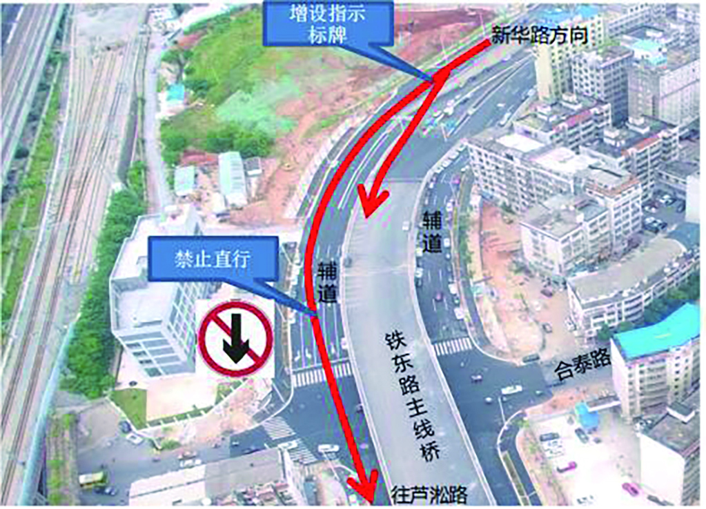 2、铁东路与合泰路交叉口:铁东路北进口禁止直行,直行车辆全部上主线桥,降低地面平交口的交通压力,优化信号配时方案,优先保障铁东路—市府路方向交通。