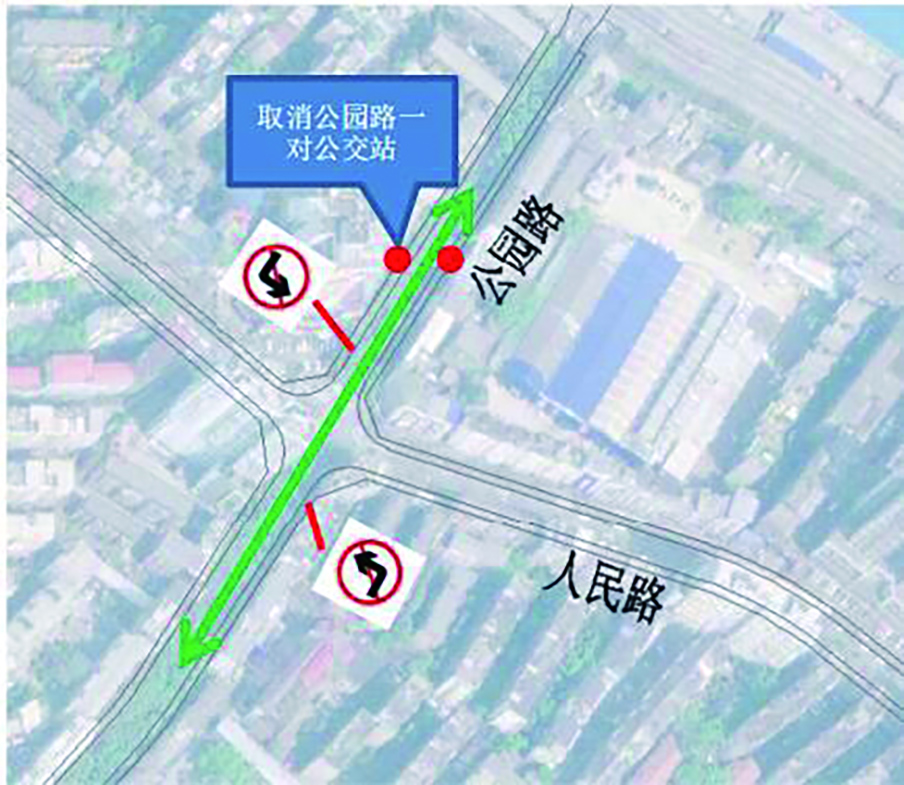 1、公园路与人民路交叉口:为缓解公园路交通压力,保证公园路东西向直行主流向,东西进口禁止左转,并取消一对干扰较大的公交站。