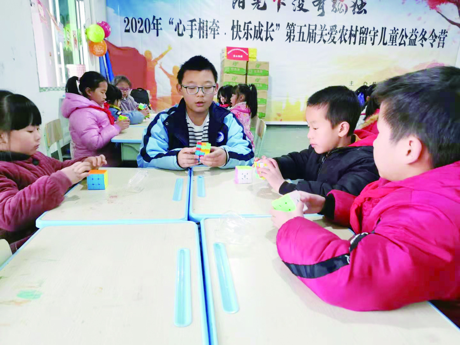 ▲活动现场,城乡孩子一起玩魔方 记者 何春林 摄