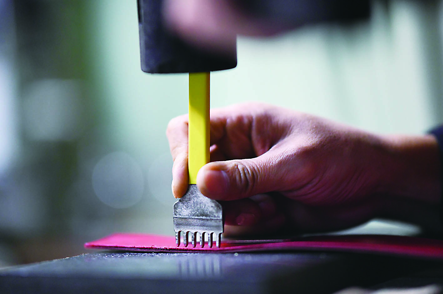 ▲用铁錾在皮革上打出排列规整的小孔