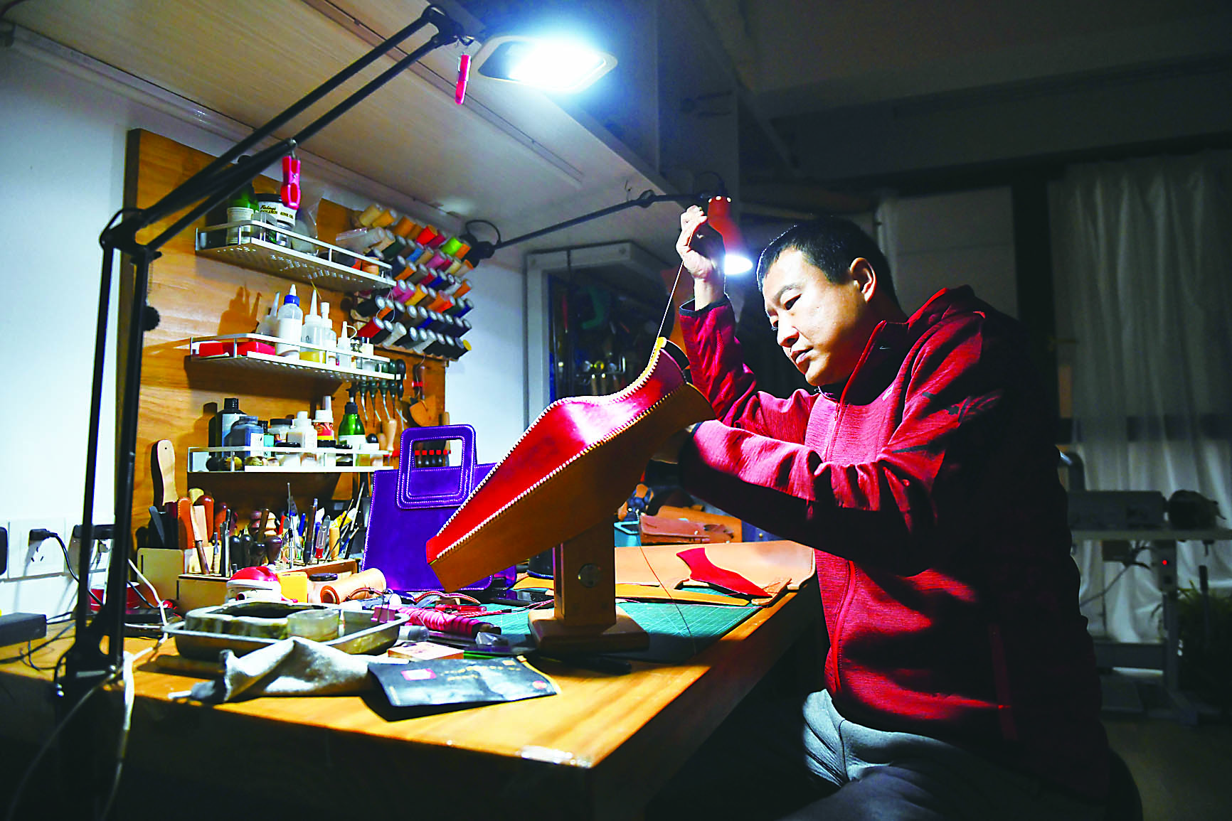 他是一名手工皮革制作“狂热爱好者”,周末的时候,常常会独自捣鼓至凌晨三四点。灵感迸发时,更是停不下来,越做越有味。