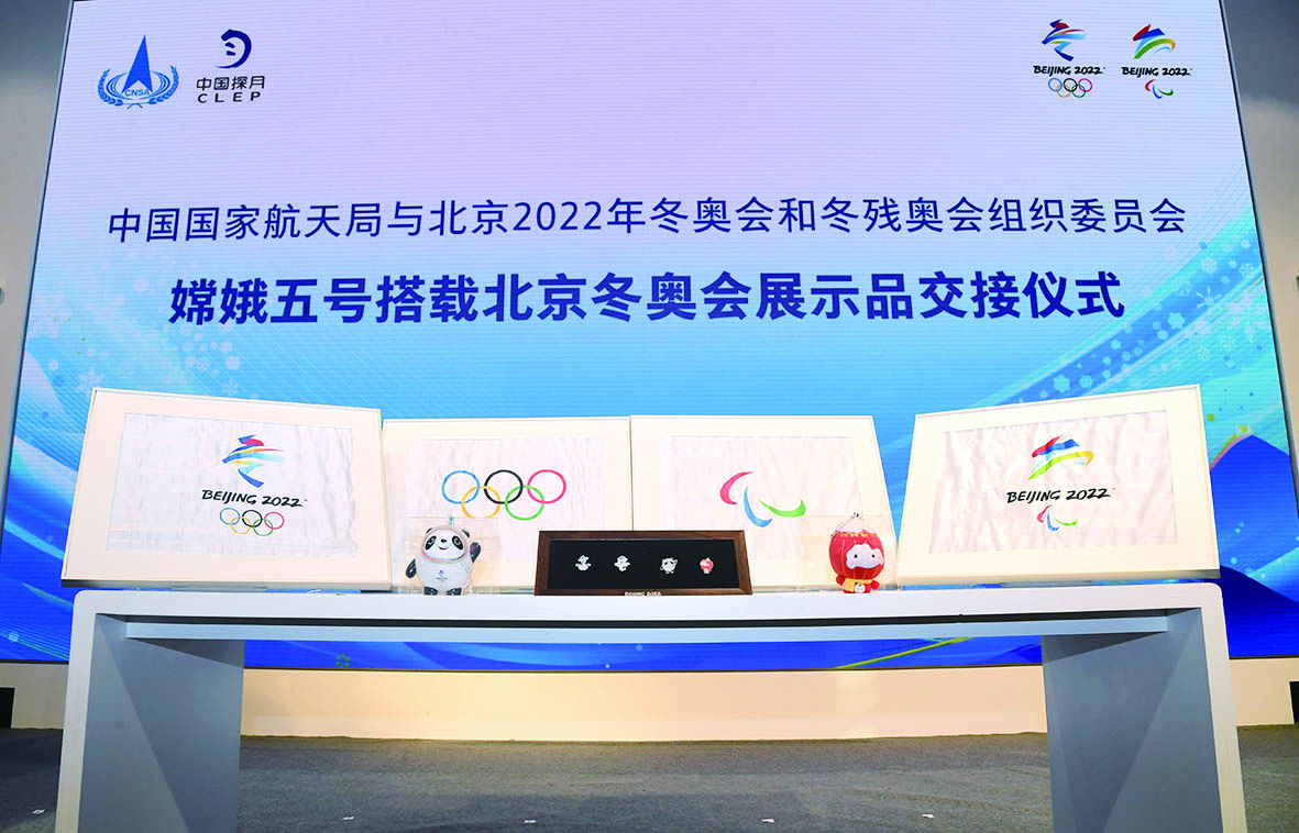 21日,在中国传统节气冬至到来之际,嫦娥五号搭载北京冬奥会展示品交接仪式在北京冬奥组委首钢办公区举行。完成月球之旅的冬奥会会旗、会徽、吉祥物等展示品,终于回家了。