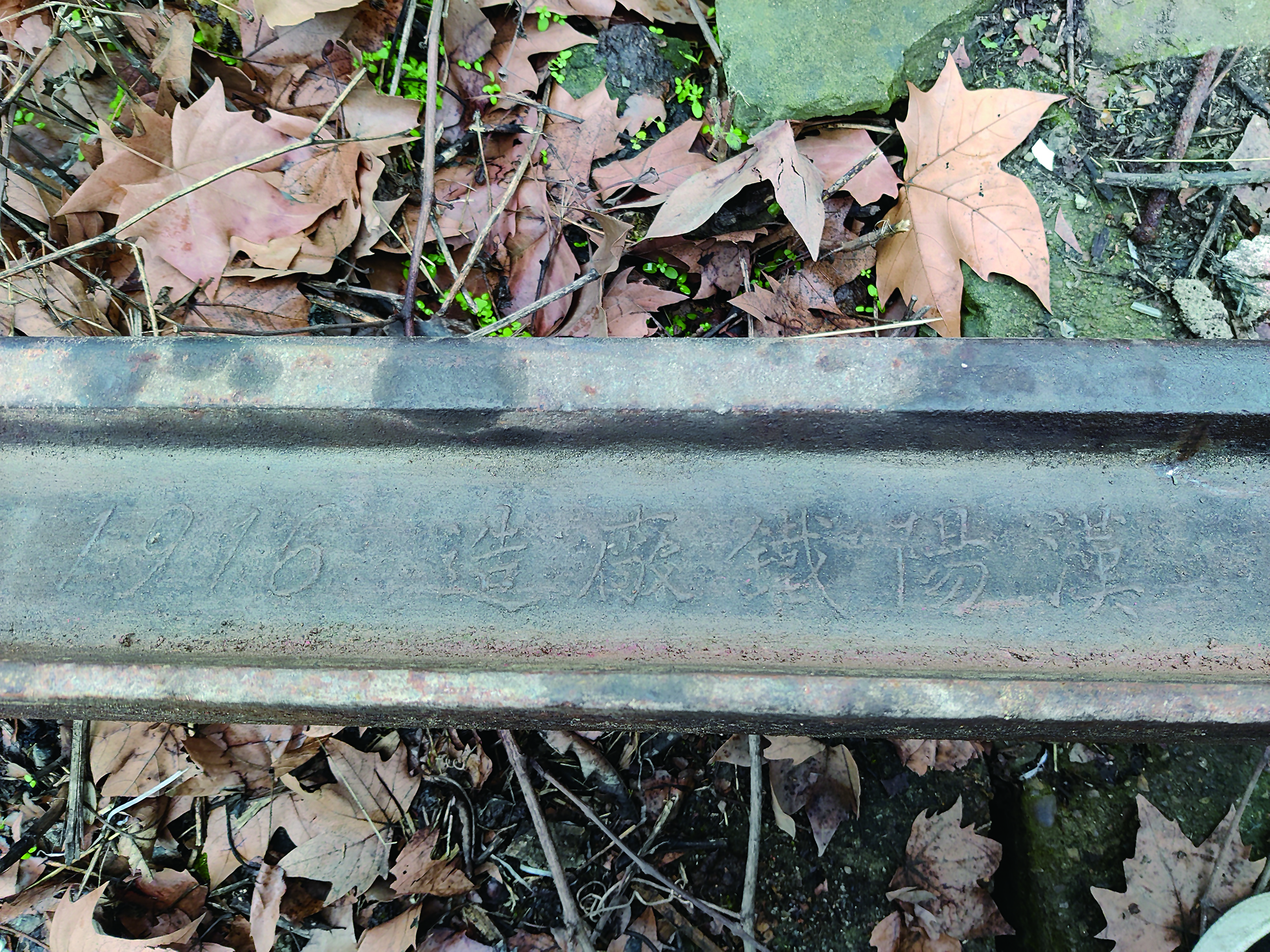 这截钢轨长约9米,内侧有清晰的“漢陽鐵廠造”和“1916”字样,除了表面有一些正常的锈迹,整体品相完好,没有弯曲、断裂的痕迹,放在太阳下还能反射出金属的光泽。