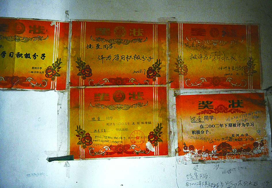 ◀家里的墙壁上贴着很多女儿的奖状