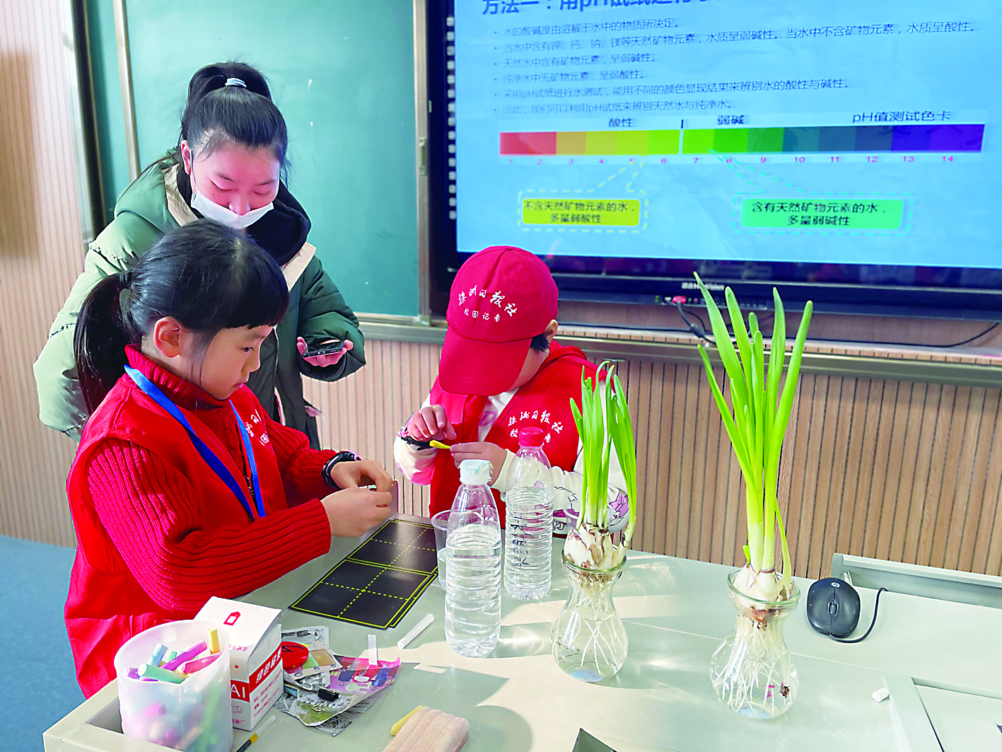 怎么辨别天然水和纯净水呢?可以用PH试纸测试出来。“哇,两杯水的颜色不一样了!”现场,校园记者通过自己动手做实验得知:天然水中含有天然矿物质,水呈弱碱性,PH试纸呈黄色;纯净水相反,PH试纸呈浅绿色。
