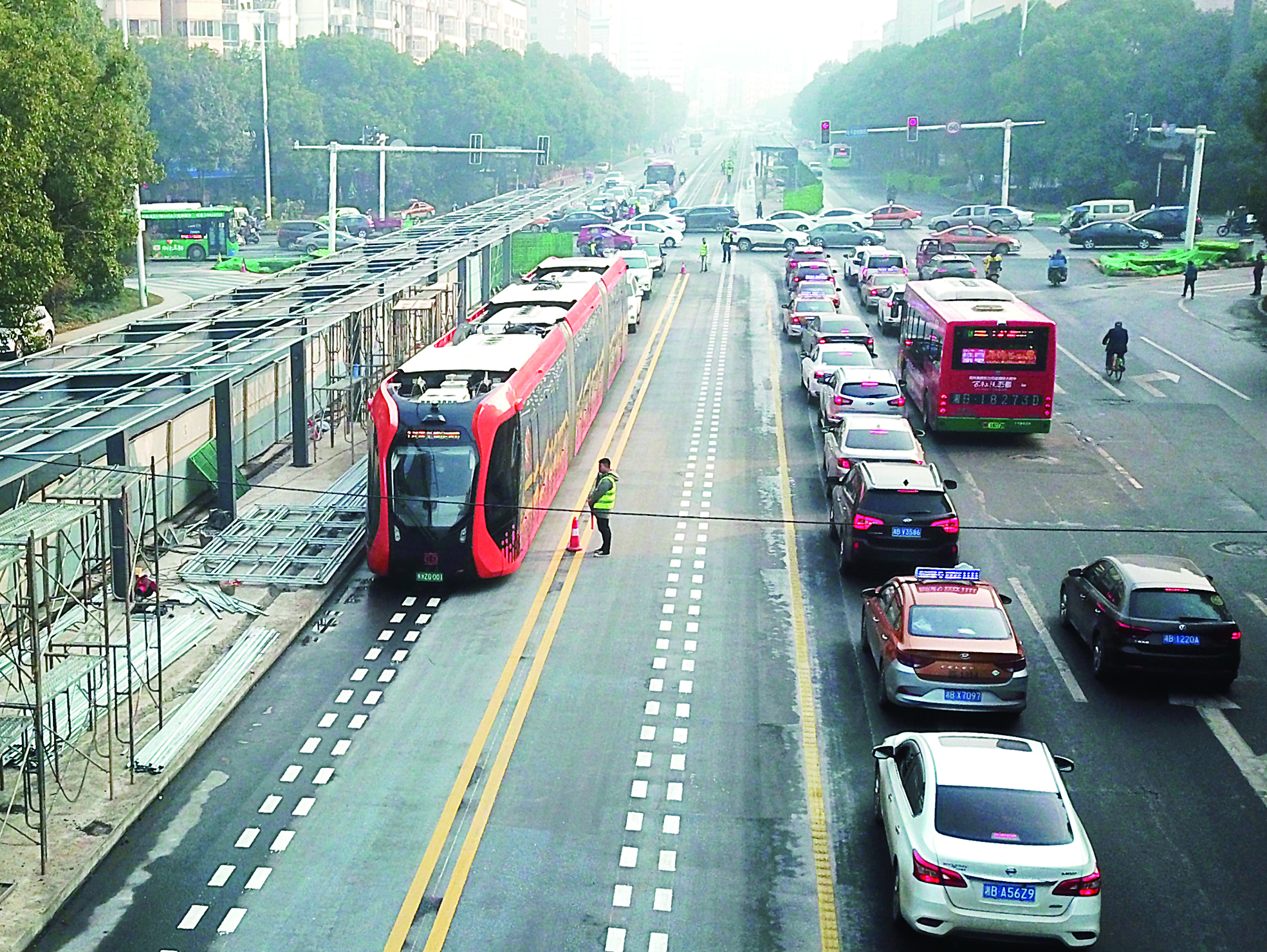 记者发现,虽然此次为新路段试跑,但在工作人员指挥下,未发现社会车辆占用智轨廊道的现象,试跑过程非常顺利。