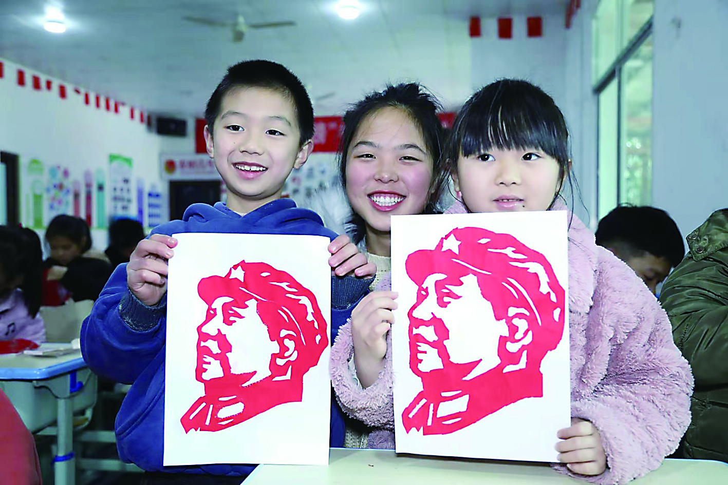 剪纸纪念毛泽东 昨日是毛泽东同志127周年诞辰日,大学生志愿者与罗立新老师在白关书画院里,教授留守儿童剪出百余份毛泽东同志肖像。志愿者们还讲述了长征故事,陪伴孩子们度过了充实的一天。 (记者 戴凛 摄影报道)