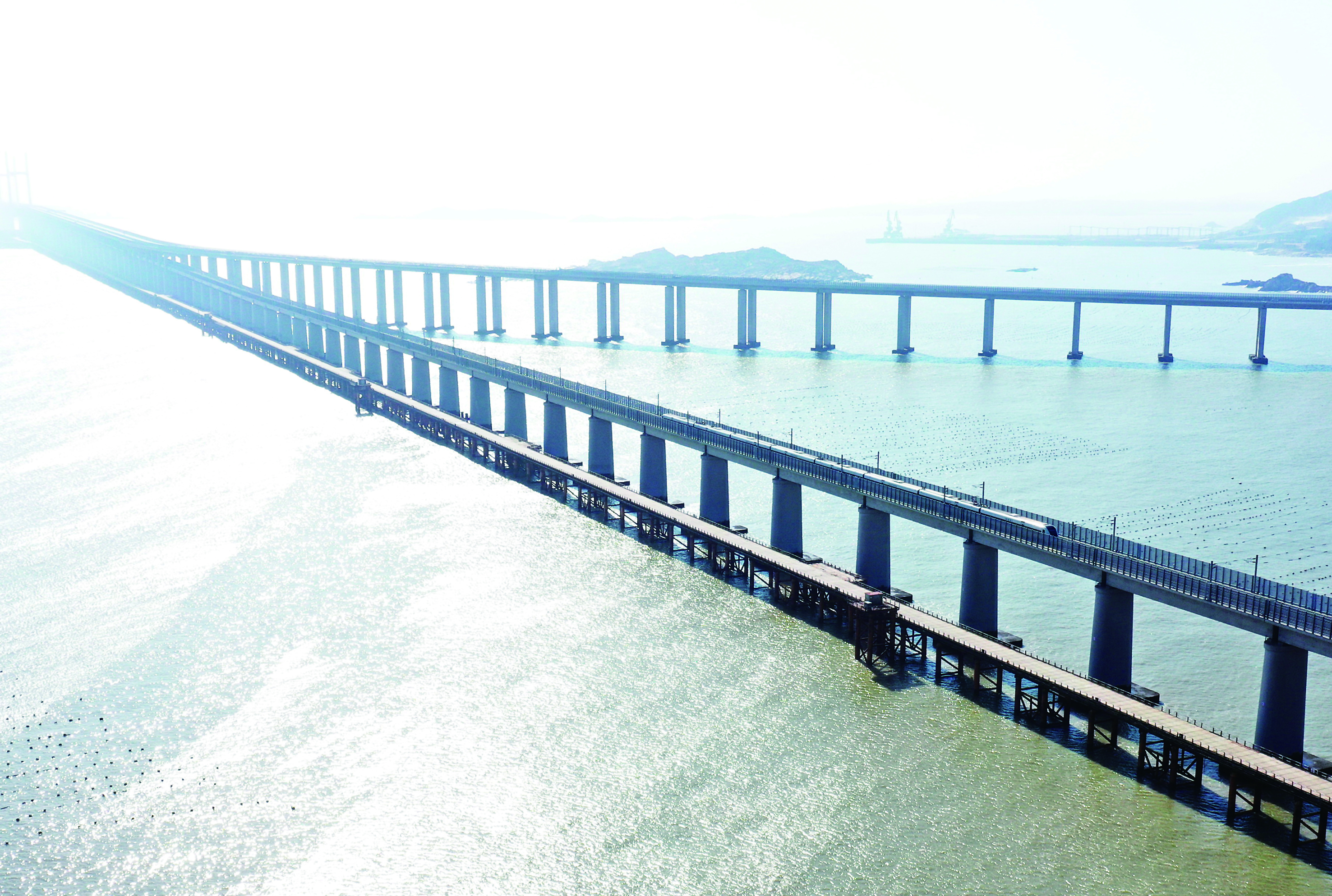 平潭海峡公铁大桥全长16.34公里,其中跨海段超过11公里,2013年开始建设。大桥上层为双向六车道高速公路,设计时速100公里,已于2020年10月开通试运营;下层为双线铁路,设计时速200公里。