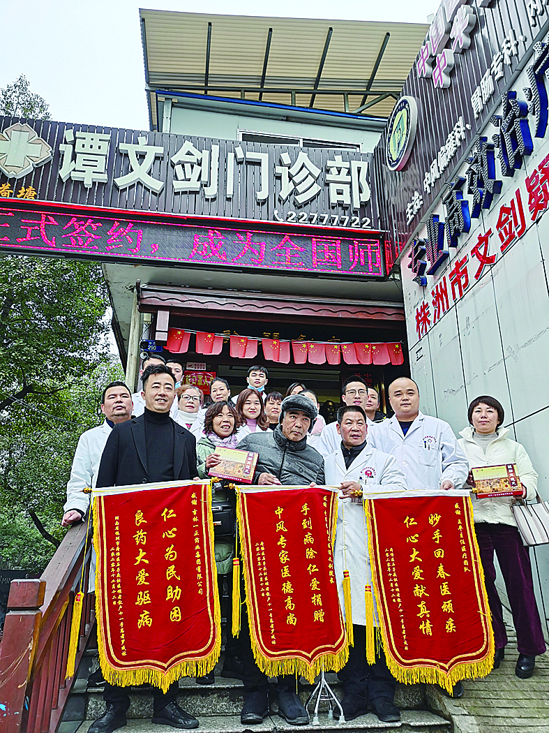 12月23号,谭文剑疑难病康复研究院门前锣鼓喧喧,热闹非凡,原来是三位中风偏瘫患者康复后送来了锦旗。