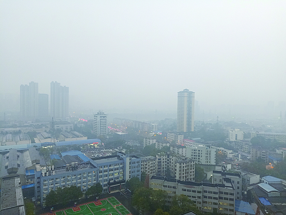 ▲受污染天气影响,城市建筑若隐若现 记者 谢慧 摄