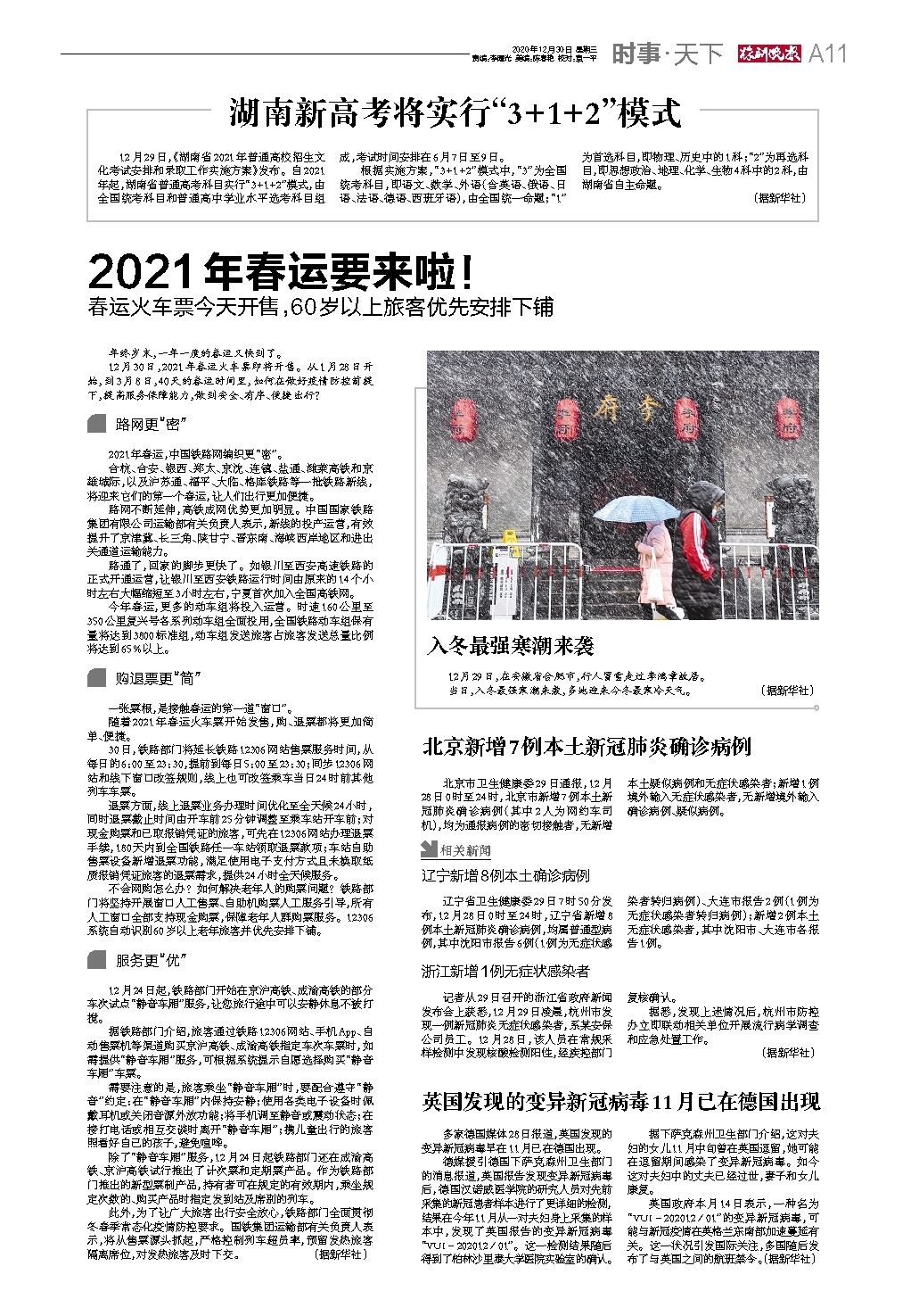 此外,为了让广大旅客出行安全放心,铁路部门全面贯彻冬春季常态化疫情防控要求。国铁集团运输部有关负责人表示,将从售票源头抓起,严格控制列车超员率,预留发热旅客隔离席位,对发热旅客及时下交。 (据新华社)