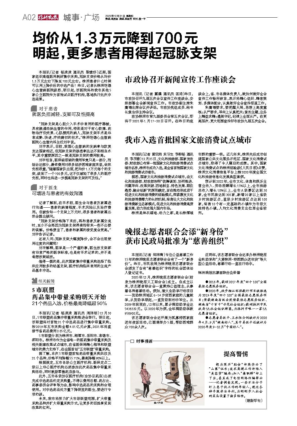 本报讯(记者 杨凌凌 通讯员 黎婕妤)近期,国家组织高值医用耗材集中采购,冠脉支架价格从均价1.3万元左右下降至700元左右。株洲患者什么时候可以用上降价后的中选产品?昨日,记者从株洲恺德心血管病医院获悉,明日起,该医院将和我市其他5家公立医院作为首批试点医疗机构,落地执行此次中选结果。