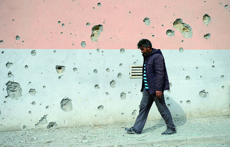 ▲9月29日,在阿塞拜疆靠近纳卡地区的塔塔尔,一名村民从布满弹孔的墙壁旁经过