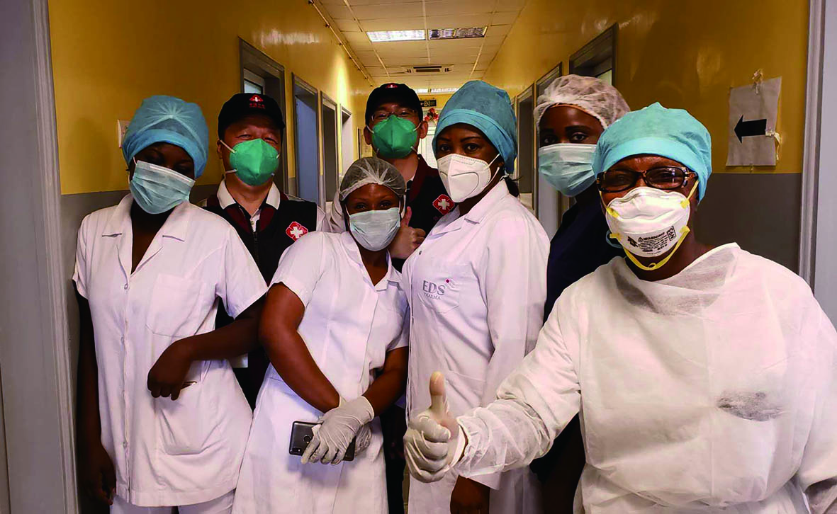 ▲5月26日,中国抗疫医疗专家组在刚果(布)首都布拉柴维尔指导新冠肺炎病房建设时,与当地一线医务人员合影