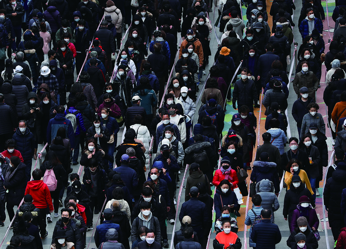 ▲3月3日,人们在韩国首尔的百货商店外排队购买口罩