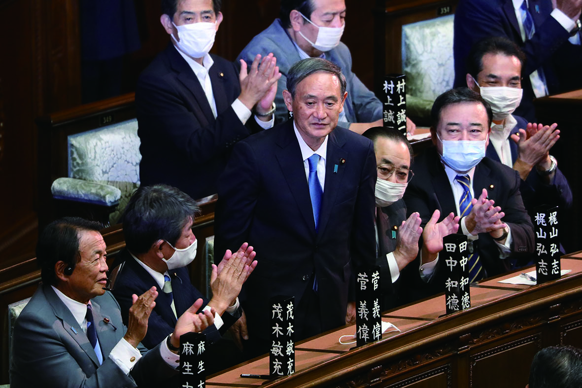 ▲9月16日,在位于东京的日本国会众议院,新当选的日本第99任首相、自民党总裁菅义伟(中)起身致谢