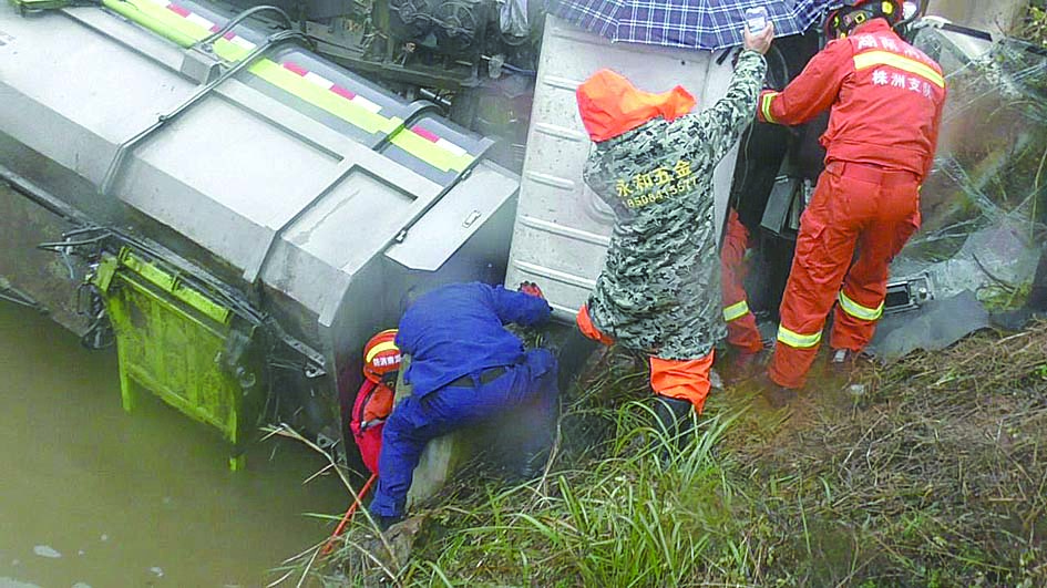 本报讯(记者 刘玺 通讯员 陶广礼 张作)前日下午,醴陵市茶山镇梅霞村的乡道上,一辆环卫车因避让对向车辆侧翻于水渠中,还好被困的男司机被消防员及时救出。