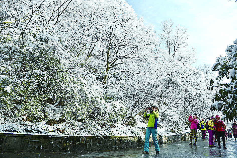 12月14日,游人在南京紫金山欣赏雪景。 近日全国多地出现降雪,雪后大地银装素裹,美景纷呈。 (据新华社)