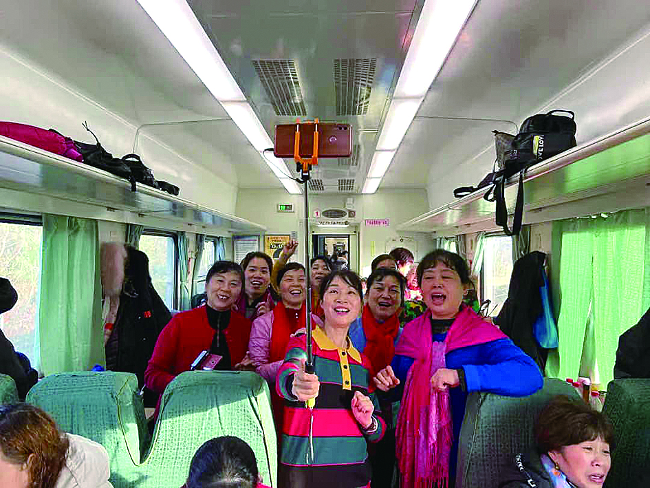 ▲在红色专列上,旅客们玩自拍 通讯员供图