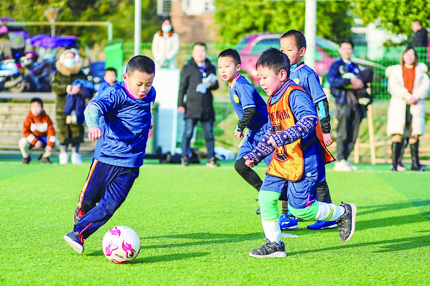 赛场上,孩子们大汗淋漓,顽强拼搏,他们积极进攻、严密防守,拼抢、带球、妙传、射门,潇洒的动作、娴熟的技巧,不时将现场气氛带入高潮;家长们也在场边为孩子呐喊助威,“以运动的方式迎接新年到来,是一个非常不错的选择。希望孩子能够享受比赛的过程,提升身体素质,增强团队精神。”一名参赛孩子的母亲这样说道。