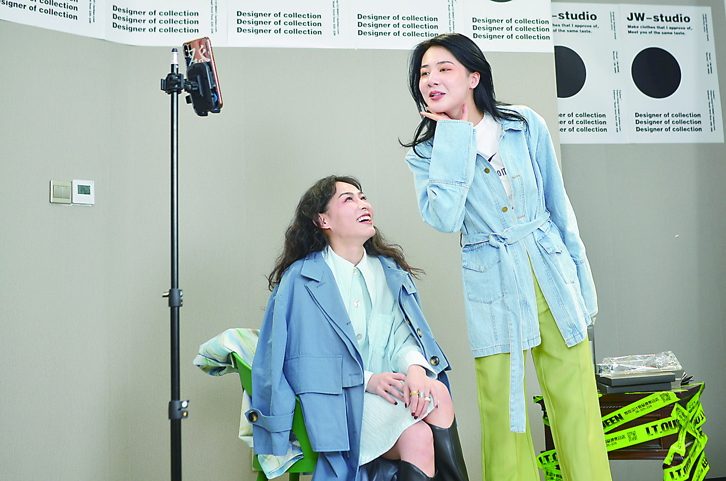 ▲2020年3月5日,主播蕾蕾(右一)和搭档紫嫣穿着新款服饰在直播间与粉丝互动。疫情期间,很多服装经营户开启了直播带货之路