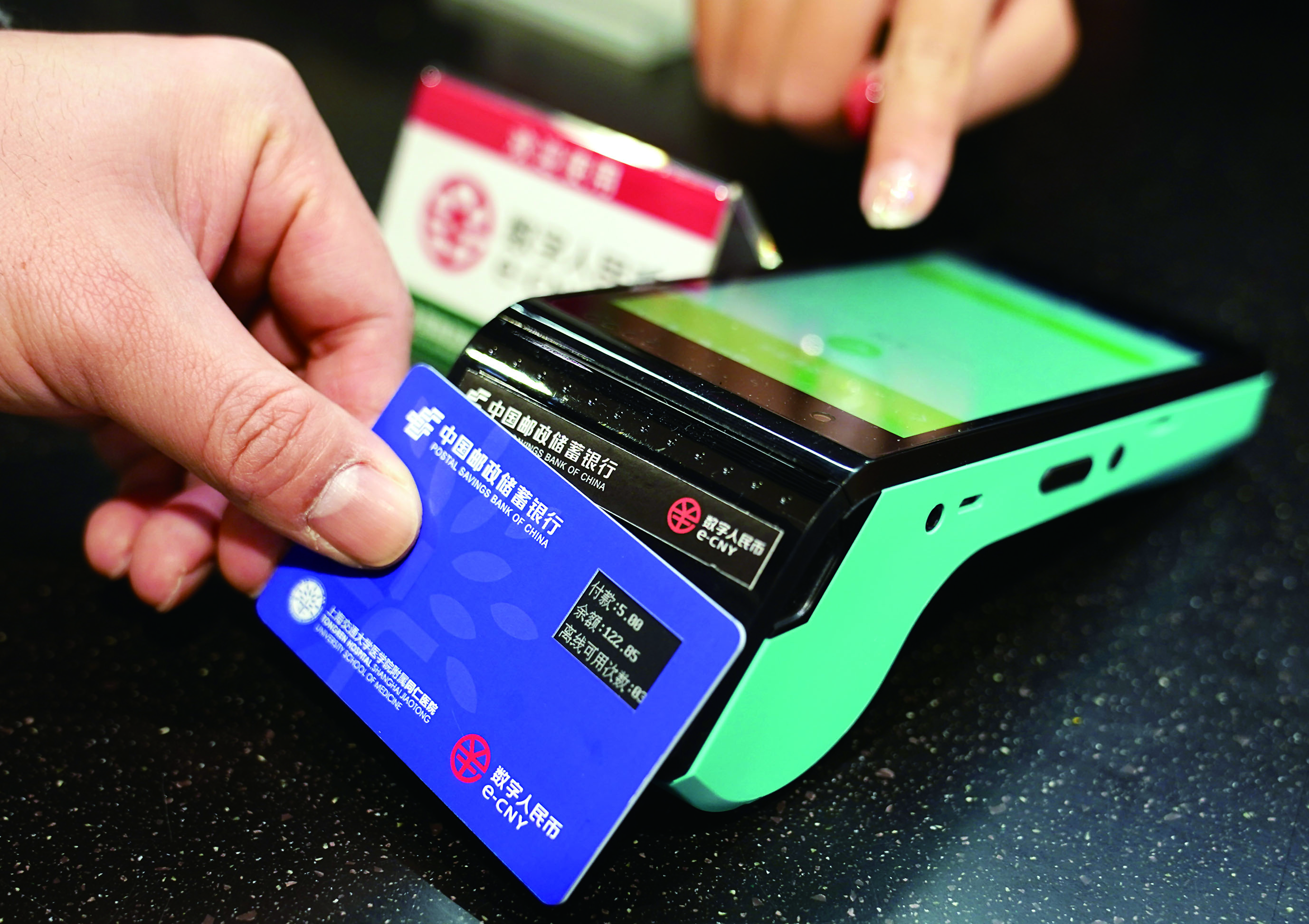 ◀1月5日,在上海交通大学医学院附属同仁医院员工食堂,员工通过数字人民币“硬钱包”支付