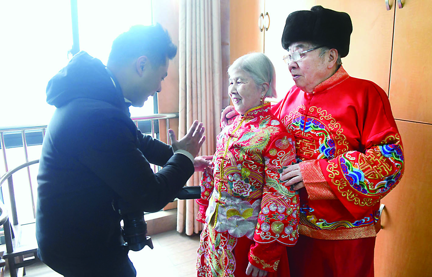 85岁的王化孚老人和80岁的李春秀老人今年迎来了他们的“钻石婚”。老家辽宁的王化孚1958年来到株洲,长期从事经济建设工作,直至离休。聊及株洲的发展与变化,王化孚用“翻天覆地”四个字进行了概括。去年,因为腰椎间盘突出做了手术,腿脚没有好利索,老人只能拄着拐杖慢慢行走。老伴李春秀因为中风,记忆力衰退明显,连家人的电话号码都无法记住。平日里,他们几乎不会下楼。这一次,志愿者上门给他们拍摄了一套大红喜庆的唐装照。拍摄间隙,两位老人笑得很灿烂,不停地给大家发喜糖,庆祝他们的“钻石婚”。