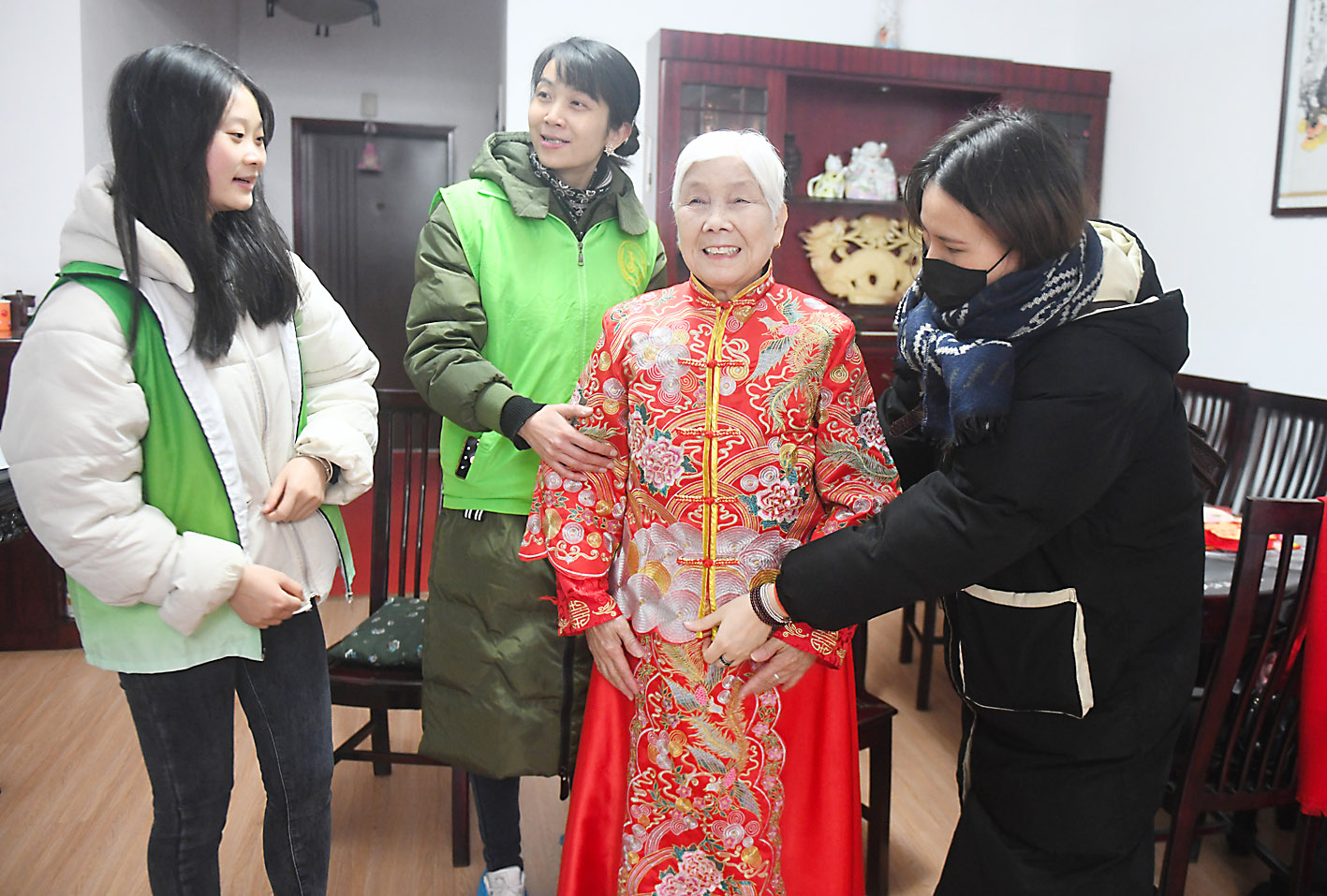 梳洗头发、抹上口红、扑上淡粉、穿上大红唐装、披上洁白婚纱……在志愿者的帮助下,三组家庭各拍摄了一套照片,迎接崭新的2021年。