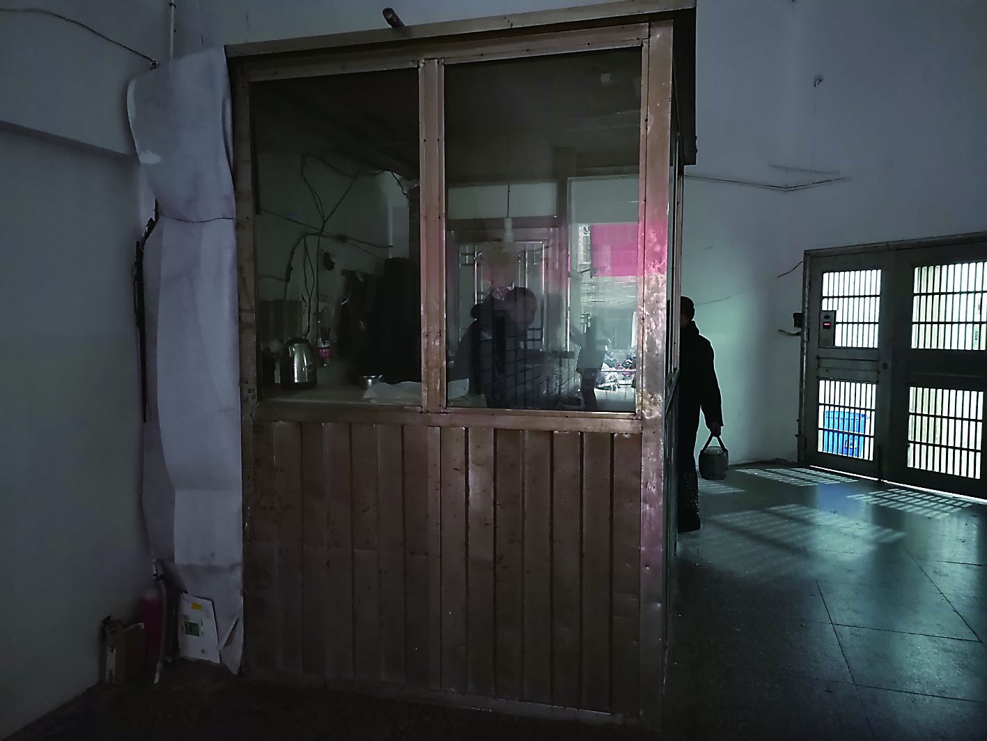 ▲老物业公司的保安在保安亭内值守 记者 姚时美 摄