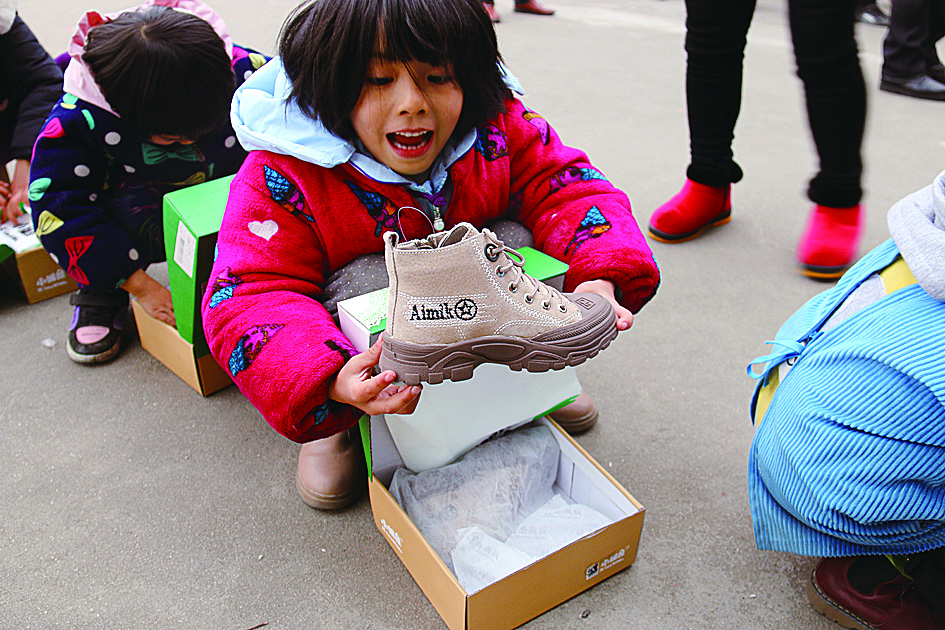 ▲孩子们领到崭新的棉鞋 通讯员供图