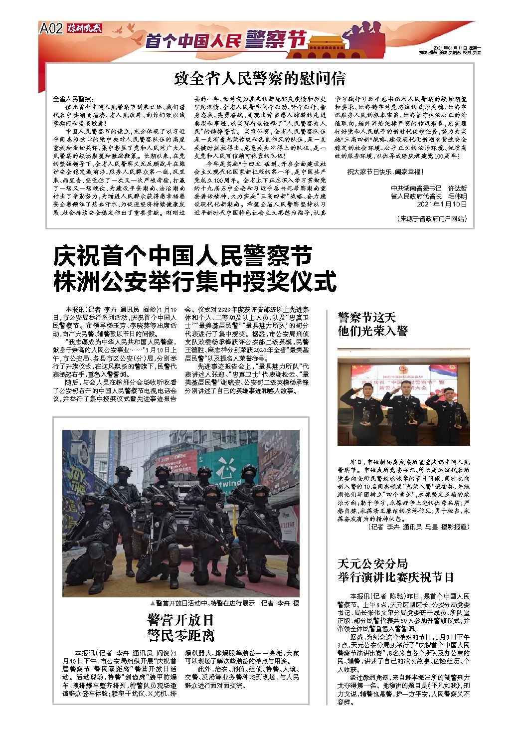 昨日,市强制隔离戒毒所隆重庆祝中国人民警察节。市强戒所党委书记、所长周运斌代表所党委向全所民警致以诚挚的节日问候,同时也向新入警的10名同志颁发“光荣入警”荣誉杯,并勉励他们牢固树立“四个意识”,永葆坚定正确的政治方向;勤于学习,永葆好学上进的优秀品质;严格自律,永葆清正廉洁的质朴作风;勇于担当,永葆奋发有为的精神状态。