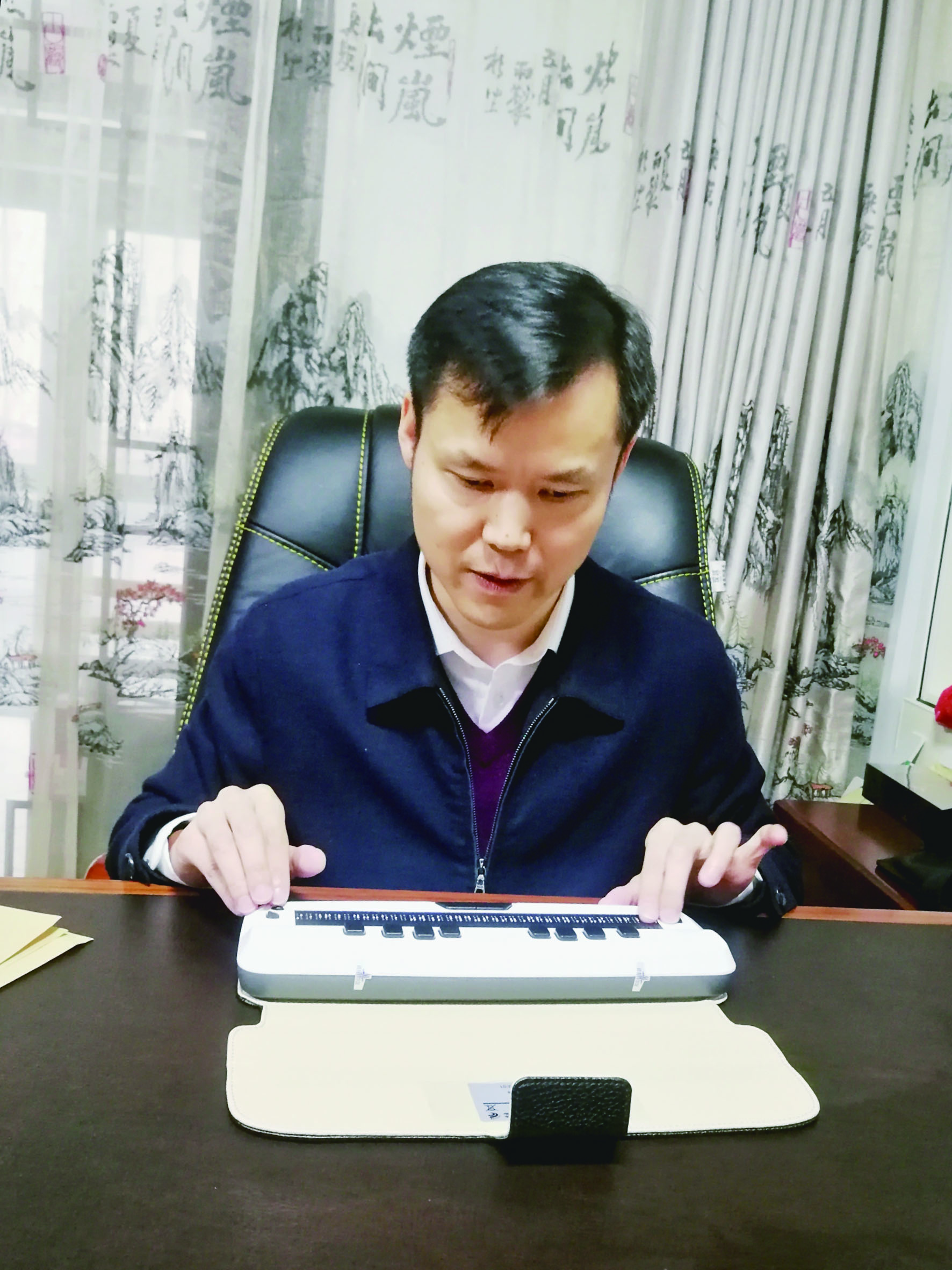 见到黄程时,他正在办公室撰写代表建议。助手拿来一些资料,随着U盘插入点写器,盲文随即生成,黄程边摸边读,十分流畅。