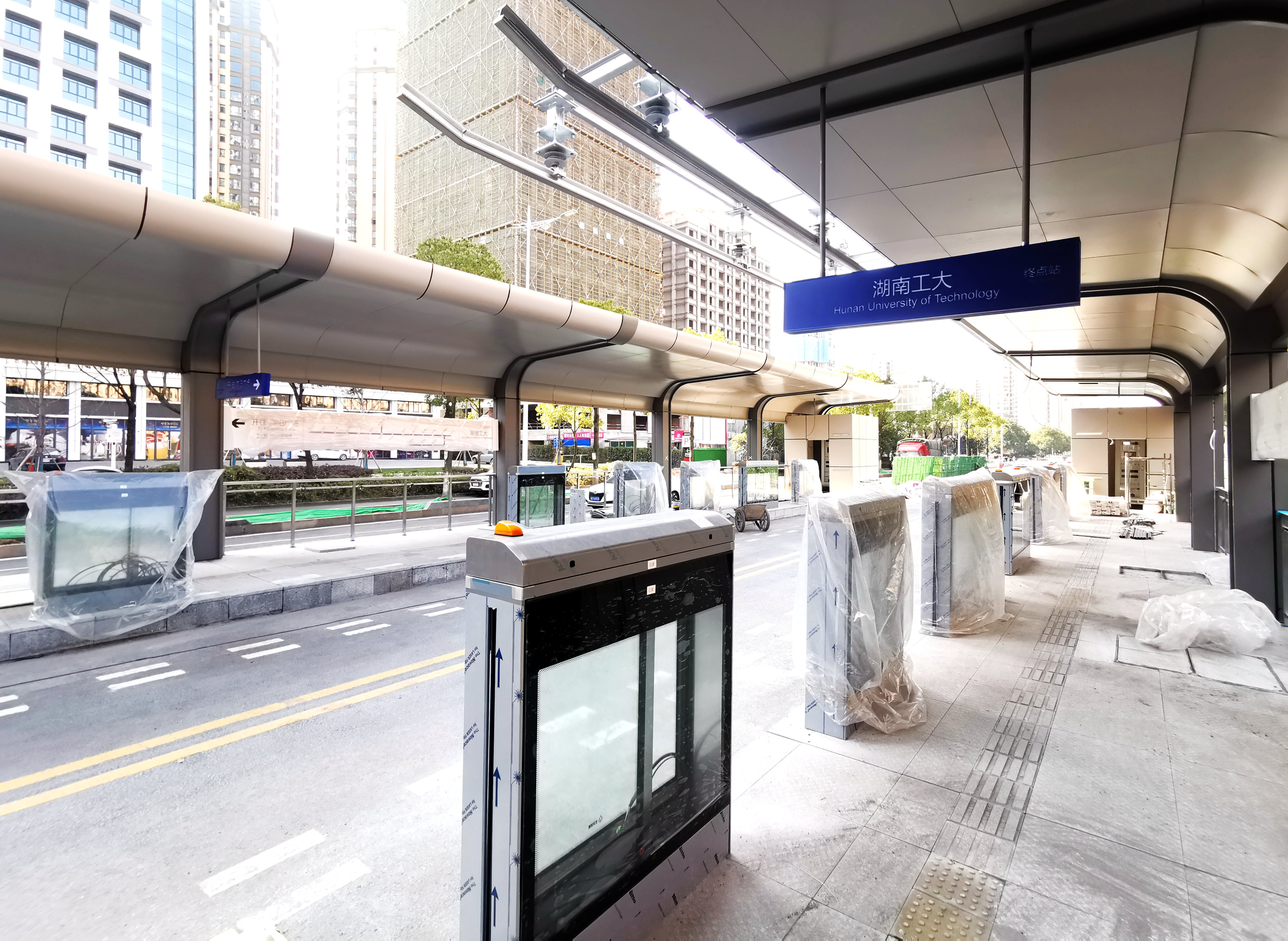 昨日中午,记者来到智轨“湖南工大”站,作为智轨一期的起点站,这里的站台已基本成型,顶棚、玻璃门均基本安装完成,站点标牌和线路走向牌也已安装到位,还有工人正在对乘客进站坡道进行施工。