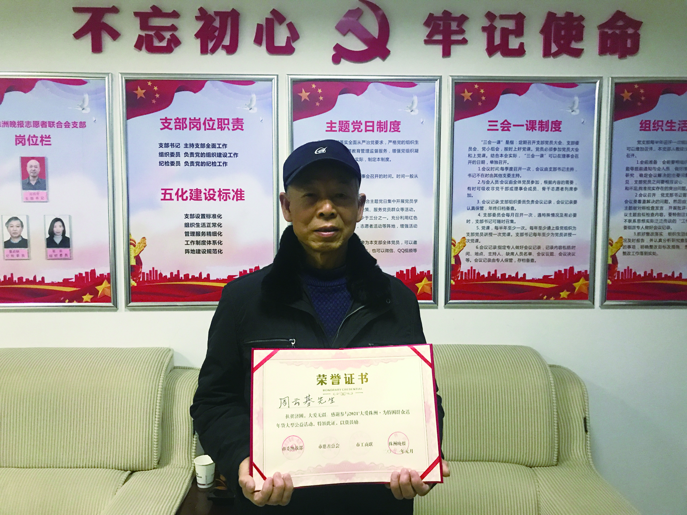 ▲周先生捐款后手捧证书拍照纪念 记者 郑炜青 摄
