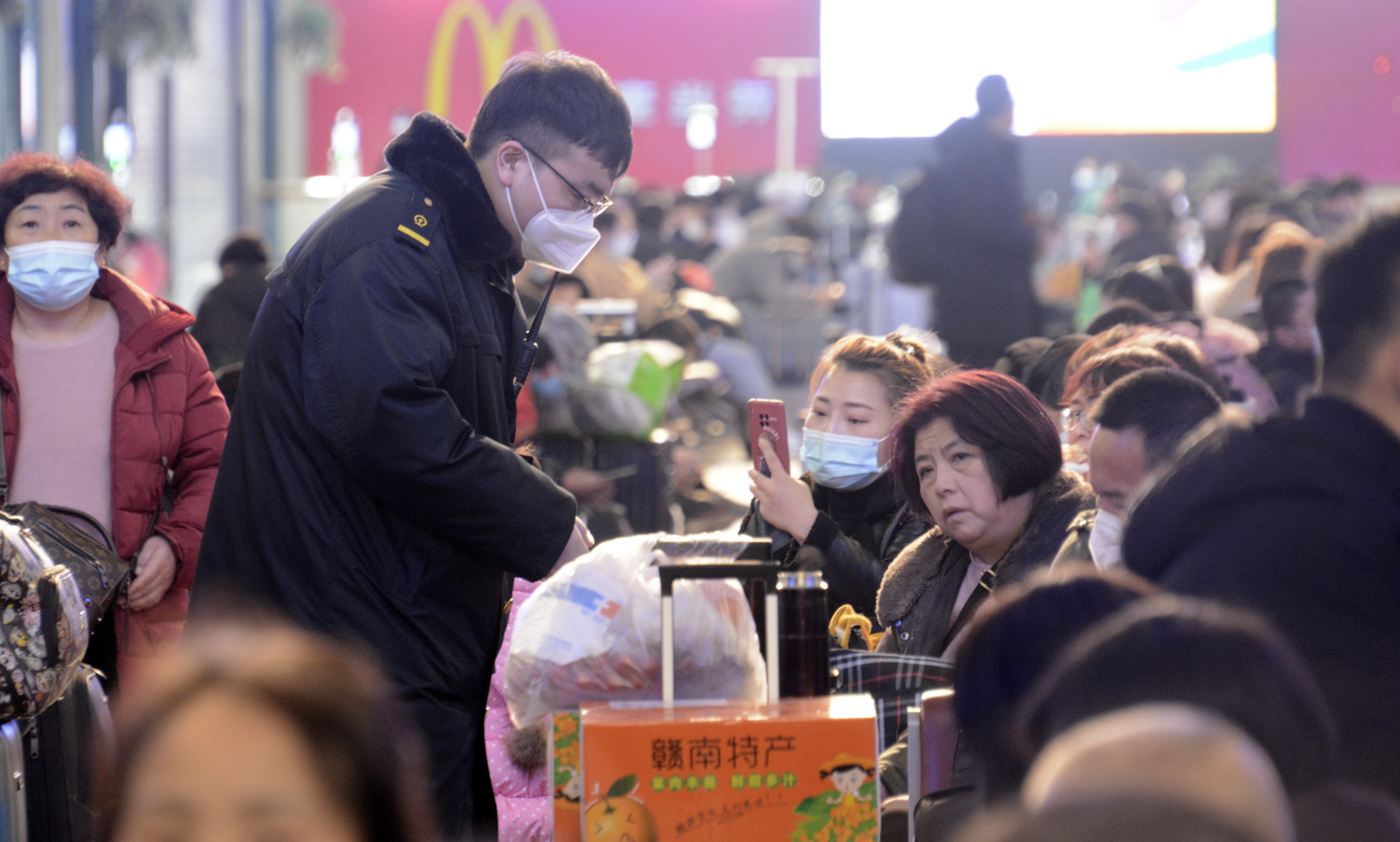 ▲1月12日,北京站工作人员在候车室进行防疫巡查,提示用餐后的旅客及时佩戴口罩