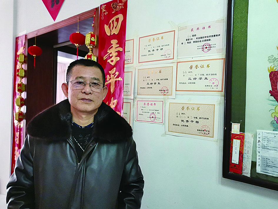 ▶李建华家的墙上贴满了女儿的奖状 记者 姚时美 摄