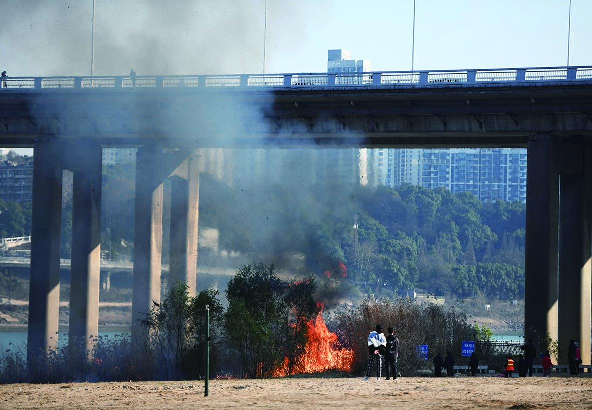 现场目击者任先生说,就在十多分钟前,一位四十岁左右的男子用打火机从江边那一头点燃了芦苇,见火势变大,该男子迅速逃离了现场。