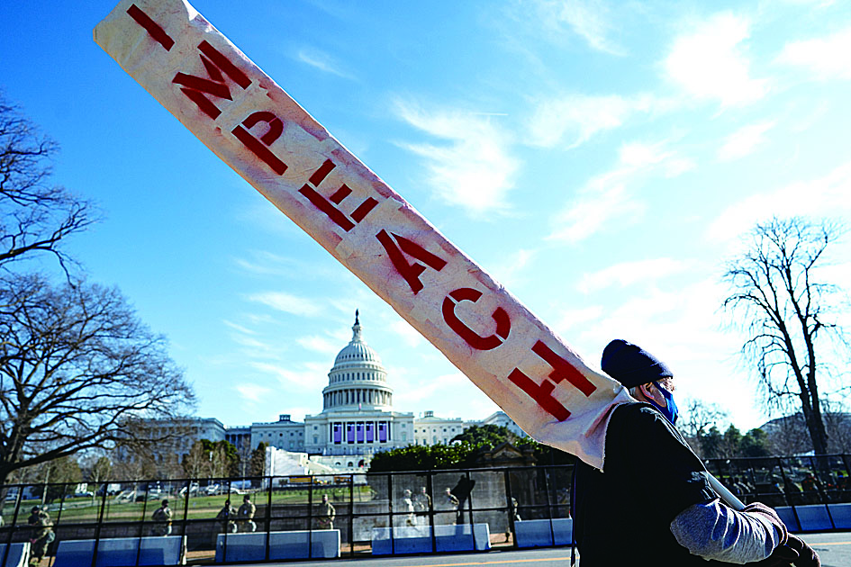 ▲1月13日,一名手持“弹劾”标语的男子从国会大厦前走过